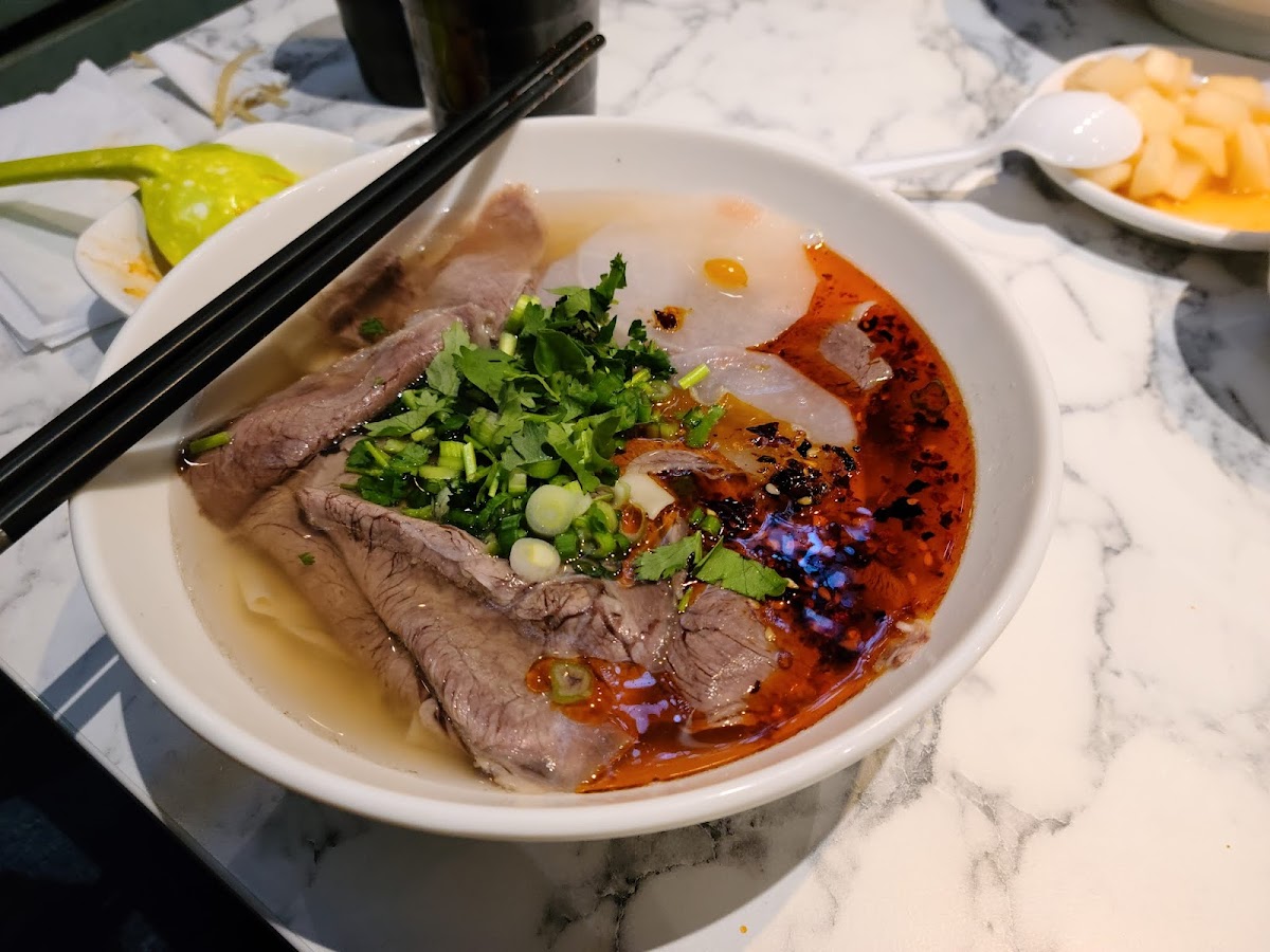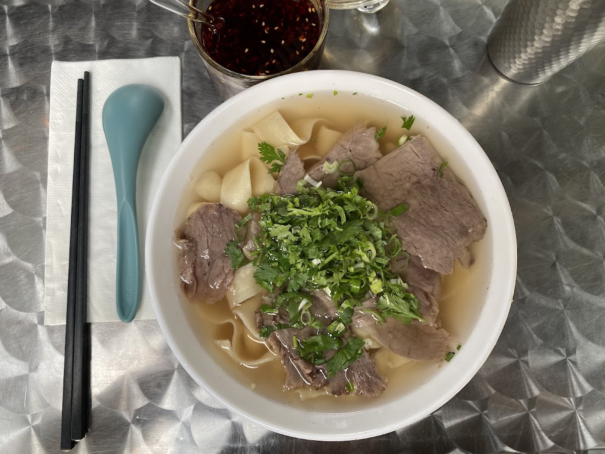 I had had a busy day, but was determined to find a noodle house for dinner and had seen this one online. It was close to where I was so I went to it. I sat on the outside patio. The wait staff was a young woman Who was excited to be asked her opinion about the menu. In fact, she asked if she could settle someone’s bill so she could then devote her time to explaining it to me, which was great. She recommended a certain dish and when I also wanted to order another she thought it would be too much and suggested I get it next time I came. Good advice. She suggested I order the beef and noodles. It’s on the first page of the menu and I think their signature dish. I was certainly not disappointed. Rich gingery broth with endless broad noodles and delicately sliced beef with cilantro and green onions. I also got her advice on the size of the noodles, which you can pick, And they brought me chili oil so I could organize my own level of heat which I also appreciated. Honestly, I’ve rarely had such an enthusiastic and helpful wait staff before. She was utterly delightful and explained about the noodles from her hometown and the culture Behind it. She was even helpful when I asked about certain etiquette when eating noodles. Anyways, suffice it to say the food was incredibly delicious, authentic and an excellent price. I will absolutely return and I highly recommend this very simple and very excellent noodle house. My bill came to $16 and I was full. I left a $10 tip for her and only wished it could have been more. Well deserved! on the way out, she passed me what I thought was a peppermint and I declined, but she insisted I take it and said it was taro with what feels like Jell-O inside and she was sure I would love it…and Just like everything else… She was right!